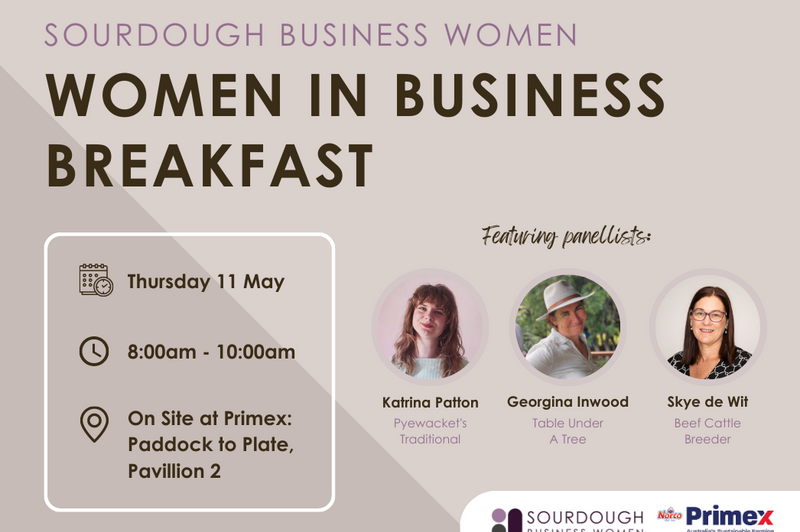Sourdough Business Women 'Women In Business Breakfast' - Thursday 11th May Join Sourdough Business Women for an exciting opening event and inaugural collaboration with Primex showcasing three local female producers. Free event. Registrations are essential.